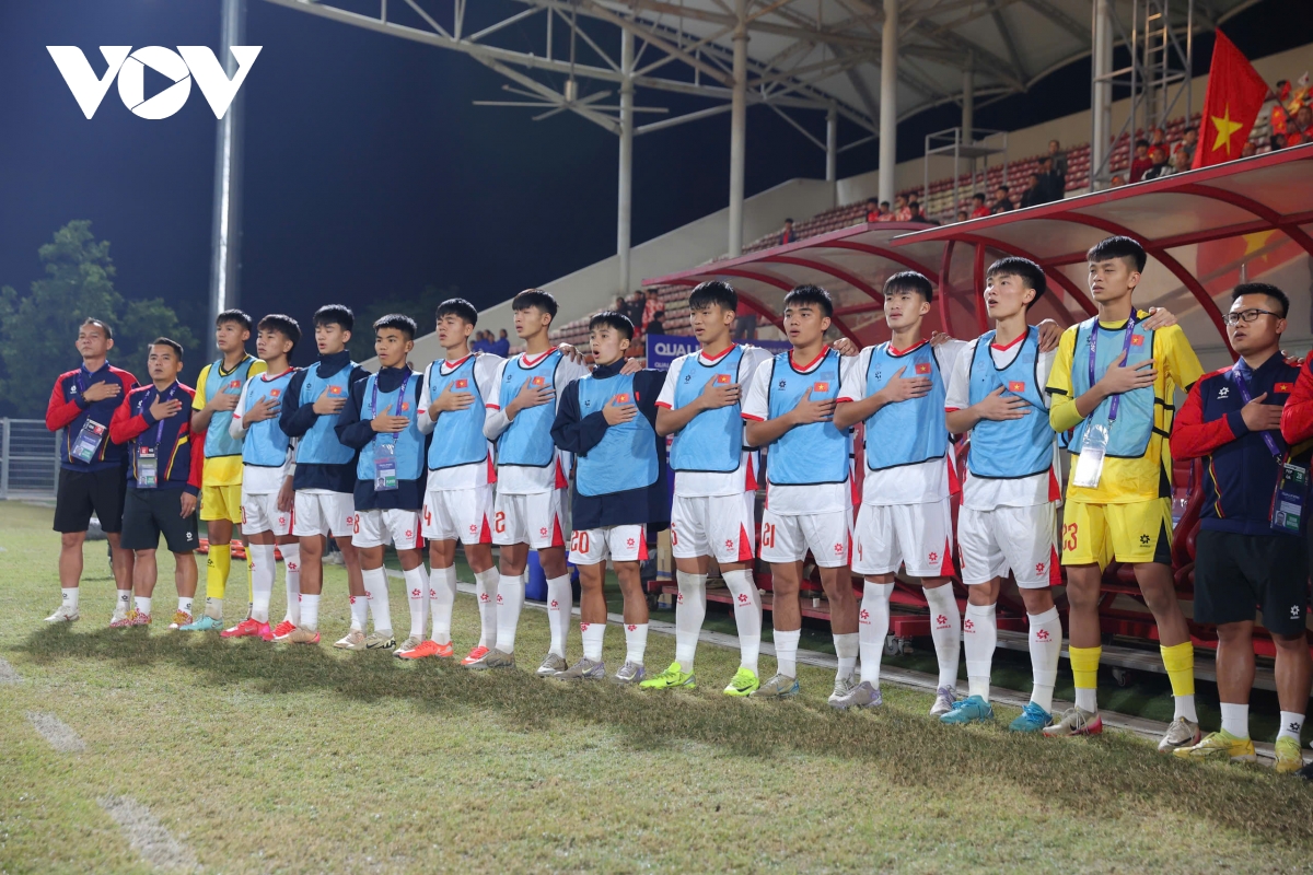 Đến phút 33, Ngọc Sơn đi bóng rất hay bên cánh phải rồi đập nhả với đồng đội là Quý Vương trước khi dứt điểm tinh tế, ghi bàn thứ ba cho U17 Việt Nam.