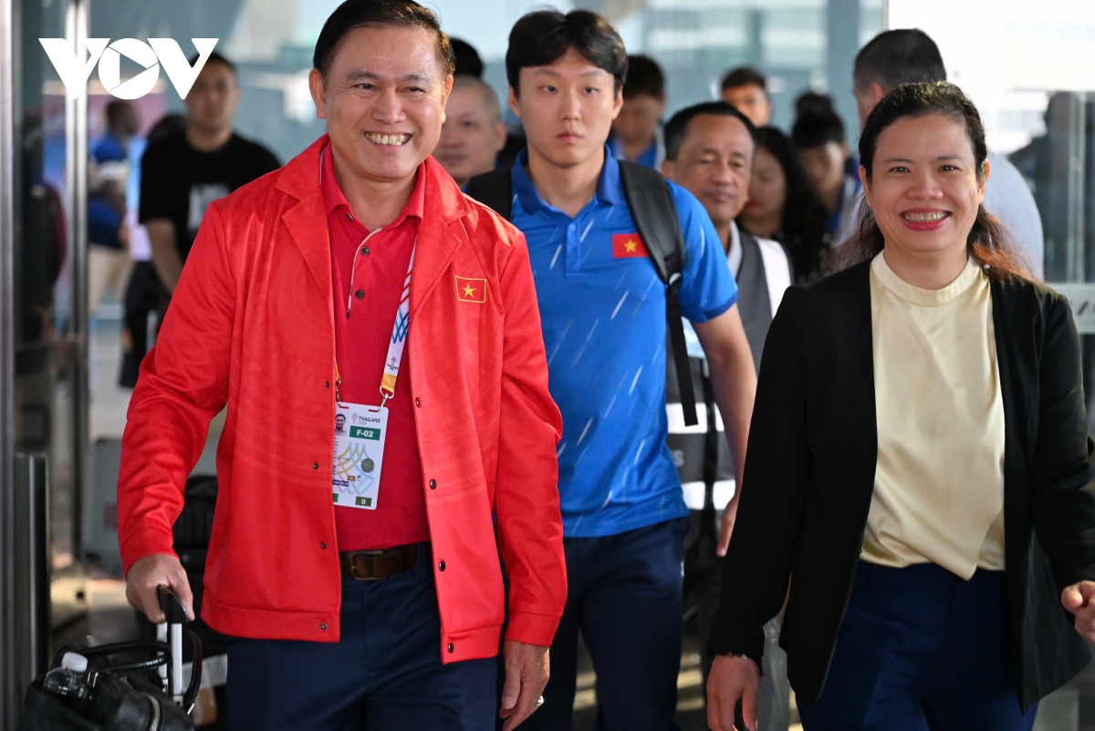 Có mặt tại sân bay đón đoàn, bà Hoàng Diễm Hạnh - Tham tán Đại sứ quán Việt Nam tại Thái Lan đã gửi lời chúc thành công tới thầy trò HLV Kim Sang Sik.
