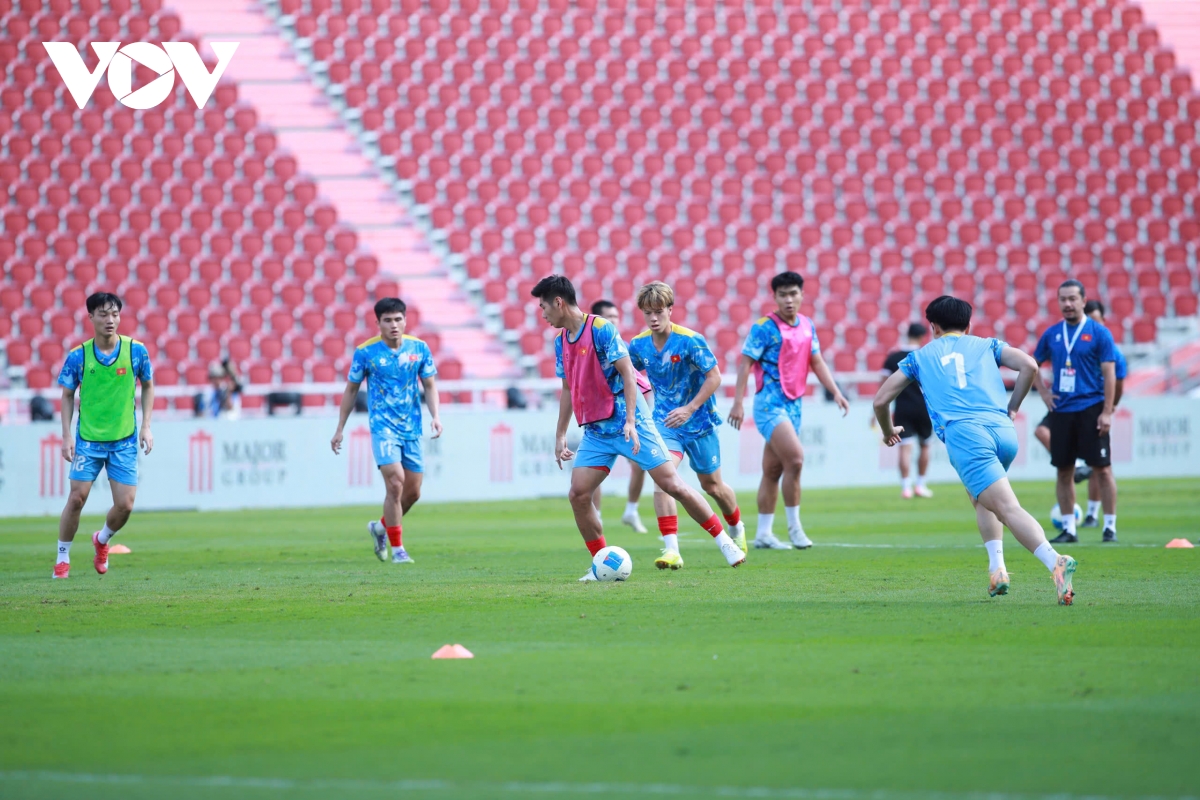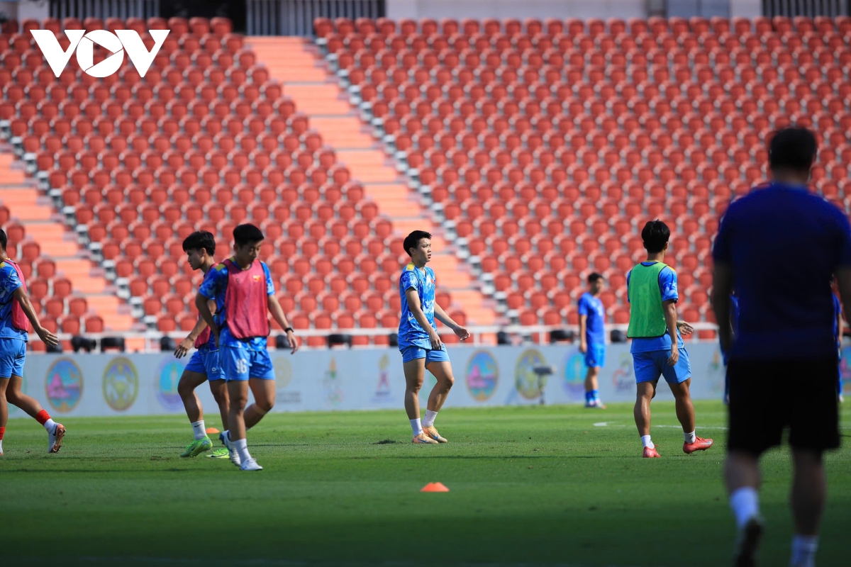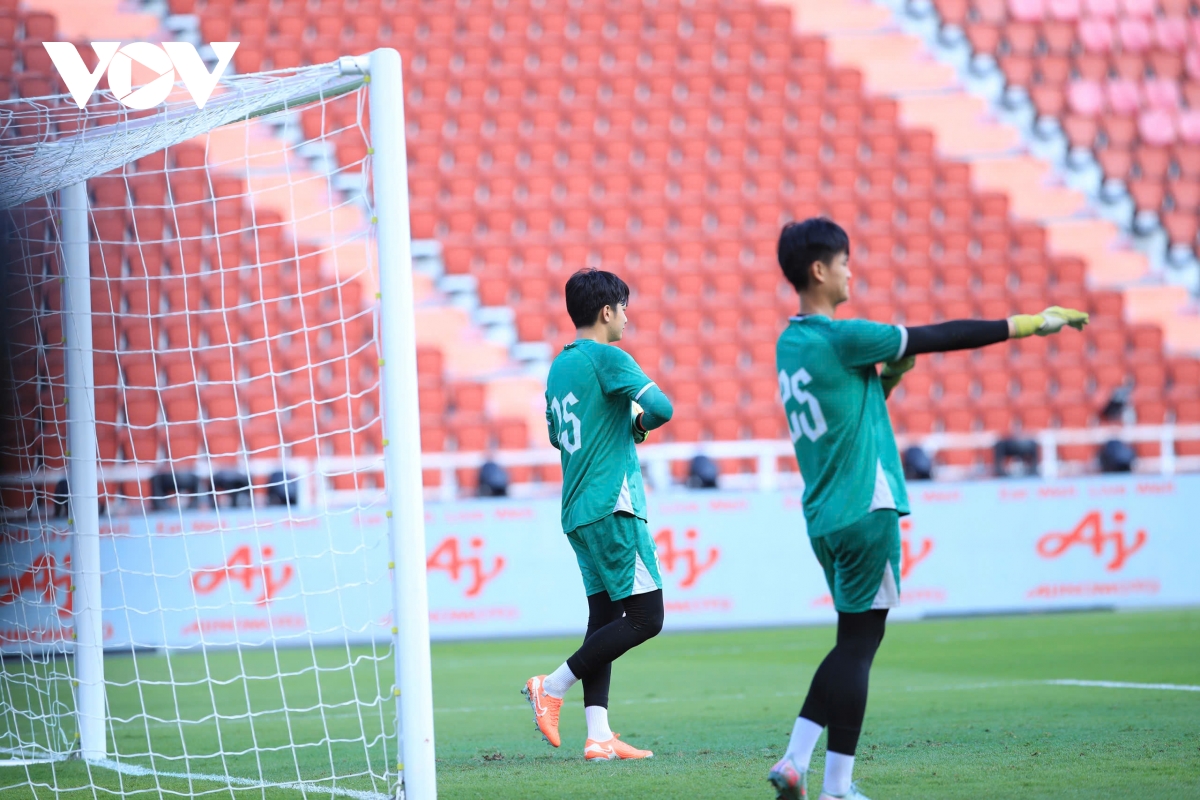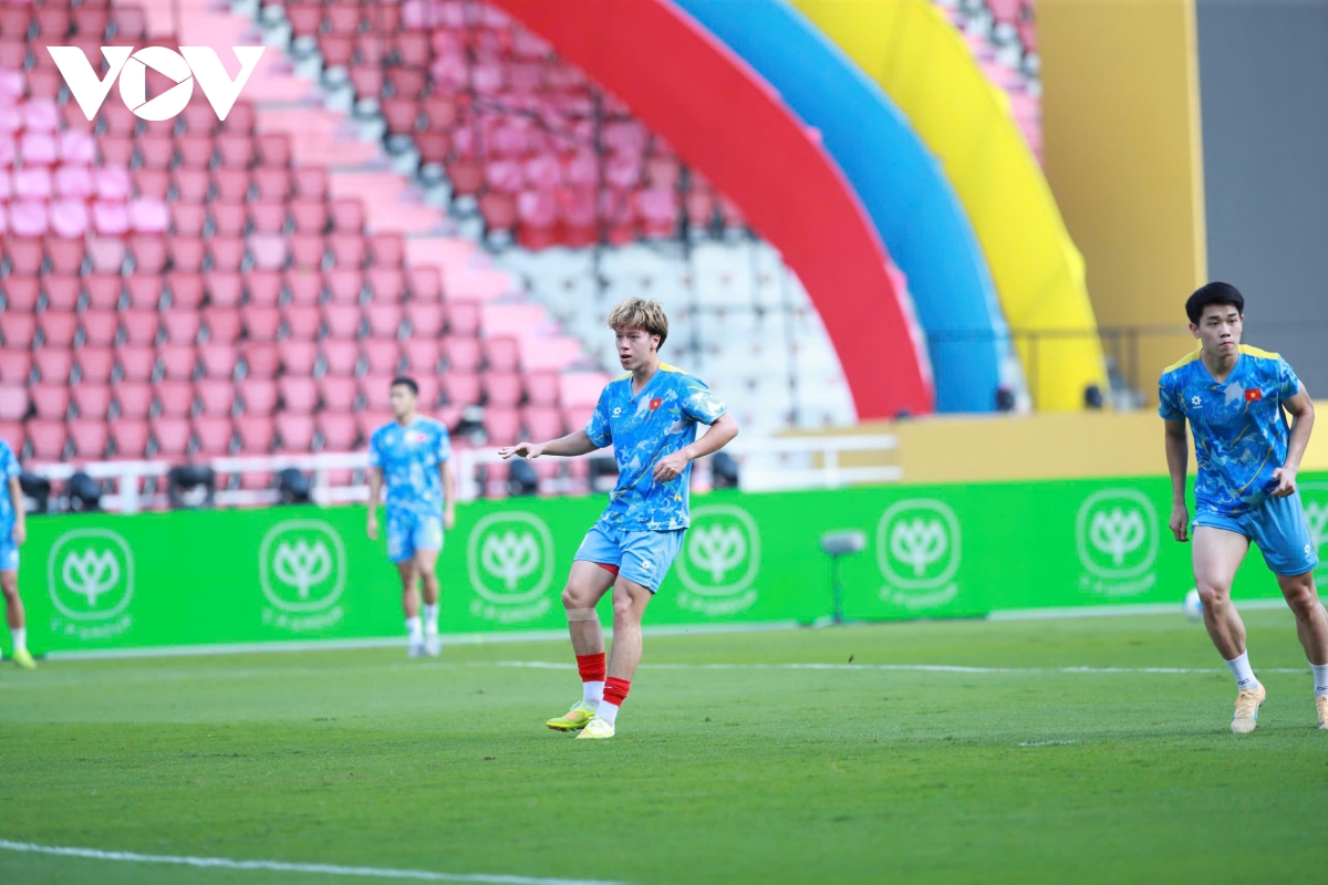 Các cầu thủ U22 Việt Nam khởi động trước trận đấu (Ảnh: Hoài Thương).