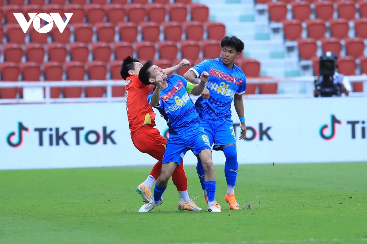 Phút thứ 5, Khuất Văn Khang có cơ hội dứt điểm sau quả tạt từ cánh trái nhưng chưa thể tận dụng. Đến phút 14, Đình Bắc đi bóng kỹ thuật rồi tung cú sút căng trong vòng cấm, song hàng thủ Philippines vẫn đứng vững. Cũng trong quãng thời gian này, Phi Hoàng và Lê Viktor nhiều lần phối hợp tạo sóng gió, tuy nhiên sự chắc chắn của thủ môn Guimaraes Nicholas khiến U22 Việt Nam chưa thể khai thông thế bế tắc.