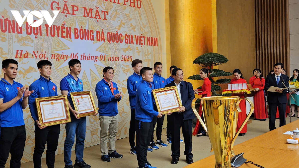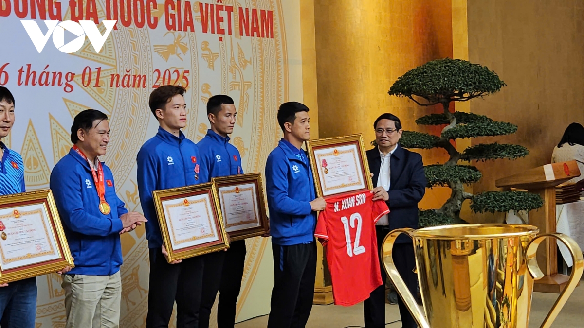 PV Vũ Khuyên/VOV thông tin một số hình ảnh về việc Thủ tướng Phạm Minh Chính trao thưởng cho Ban huấn luyện và các tuyển thủ ĐTVN với thành tích vô địch ASEAN Cup 2024. Tại buổi gặp mặt Thủ tướng Phạm Minh Chính thay mặt lãnh đạo Đảng Nhà nước trao tặng thưởng Huân chương Lao động Hạng Nhất cho Đội tuyển bóng đá Nam quốc gia. Tặng Huân chương Lao động Hạng Ba cho 6 vận động viên đội tuyển bóng đá nam quốc gia bao gồm các cầu thủ: Duy Mạnh, Quang Hải, Tiến Linh, Ngọc Đức, Đình Triệu, Nguyễn Xuân Son (đại diện tuyển thủ Xuân Son đã lên nhận thay):