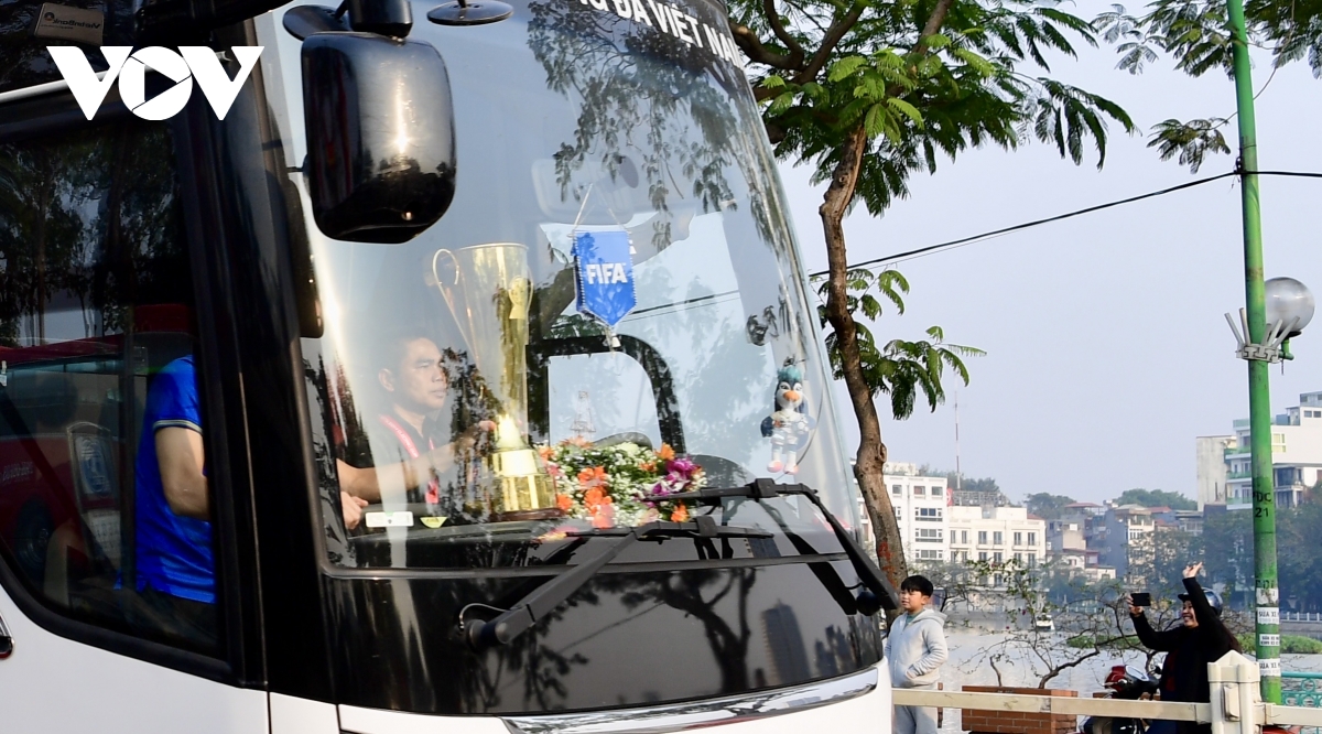 Hiện nay, Ban huấn luyện và các cầu thủ của ĐTVN đã lên xe bus, đang di chuyển về trung tâm thành phố Hà Nội. Đoàn không đi xe mui trần như dự kiến ban đầu.