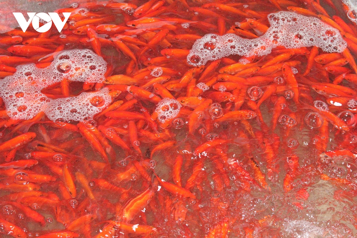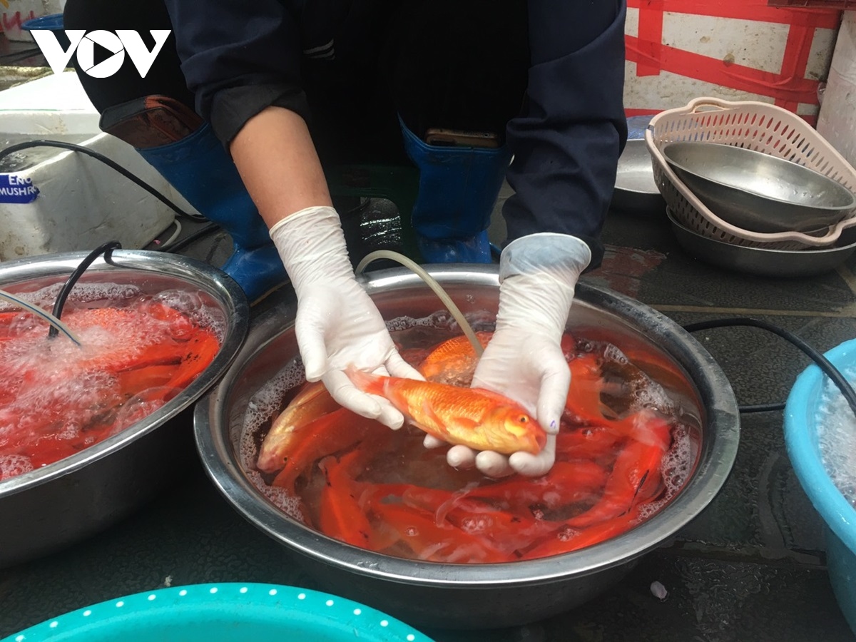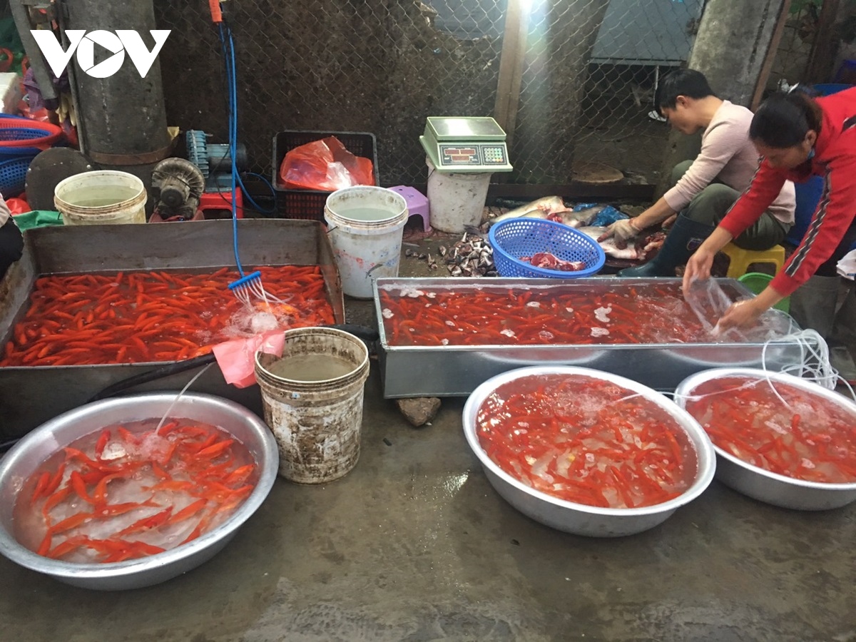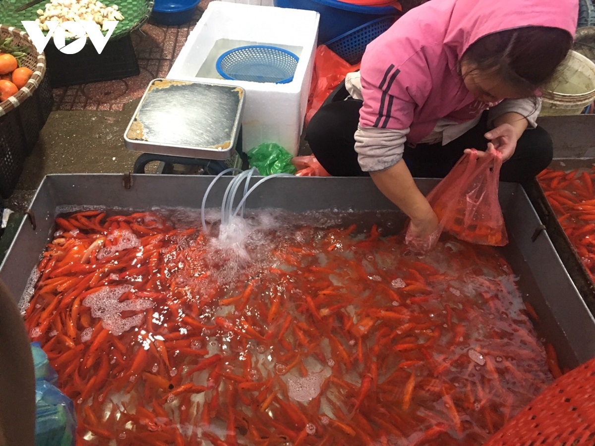Chị Mai - một tiểu thương tại chợ Long Biên cho biết: “Cá năm nay chị nhập được rẻ hơn nhưng bán chậm hơn các năm trước. Các năm trước phải 30.000 - 40.000 đồng/bộ 3 con. Nhưng năm nay chỉ 20.000 đồng/bộ loại đẹp mà khách còn không mua.”