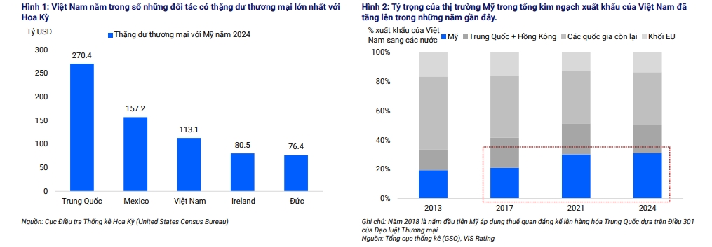 Ông Nguyễn Đình Duy, Giám đốc, Chuyên gia phân tích cao cấp xếp hạng tín nhiệm và nghiên cứu VIS Rating thông tin, thặng dư thương mại của Việt Nam với Mỹ đã tăng đáng kể trong thập kỷ qua, do xuất khẩu từ Việt Nam tăng mạnh. Mỹ là điểm đến xuất khẩu lớn nhất của Việt Nam, chiếm gần 30% tổng kim ngạch xuất khẩu của Việt Nam năm 2024.
