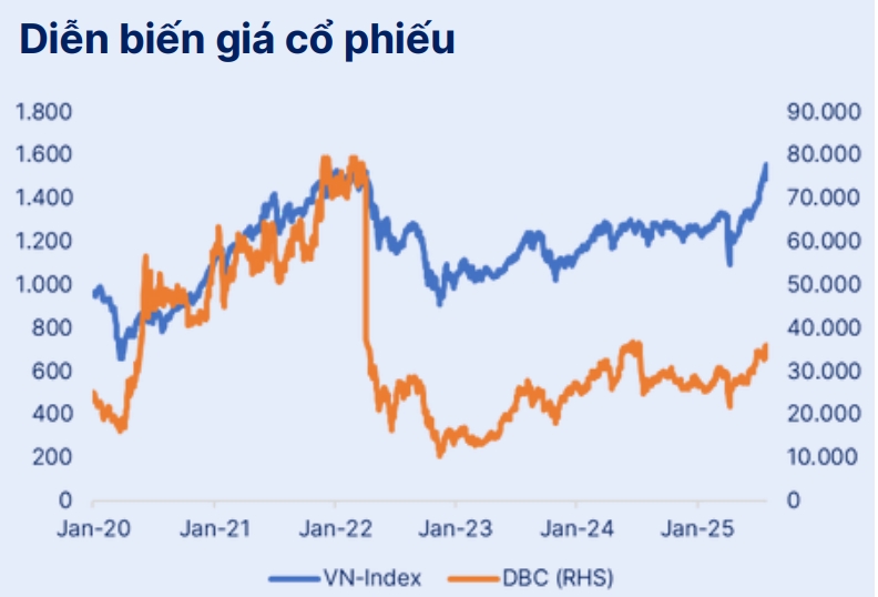 Năm 2025, SHS dự báo DBC đạt 14.587 tỷ đồng doanh thu (tăng 7,5% so với năm trước), 1.583 tỷ đồng lợi nhuận sau thuế (tăng trưởng 106%). Lợi nhuận sau thuế nửa cuối năm 2025 dự báo đạt 568 tỷ đồng do giá thịt heo hơi dự báo giảm so với trung bình khoảng 70.000 đồng/kg trong nửa đầu năm 2025.