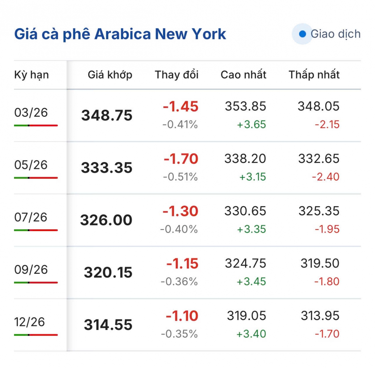 Cùng thời điểm này, giá cà phê Arabica trên sàn New York kỳ hạn hợp đồng giao tháng 3/2026 giảm 41 %, tương đương giảm 1,45 cent/lb so với chốt phiên liền trước, giá bán đang là 348.75 cent/lb.