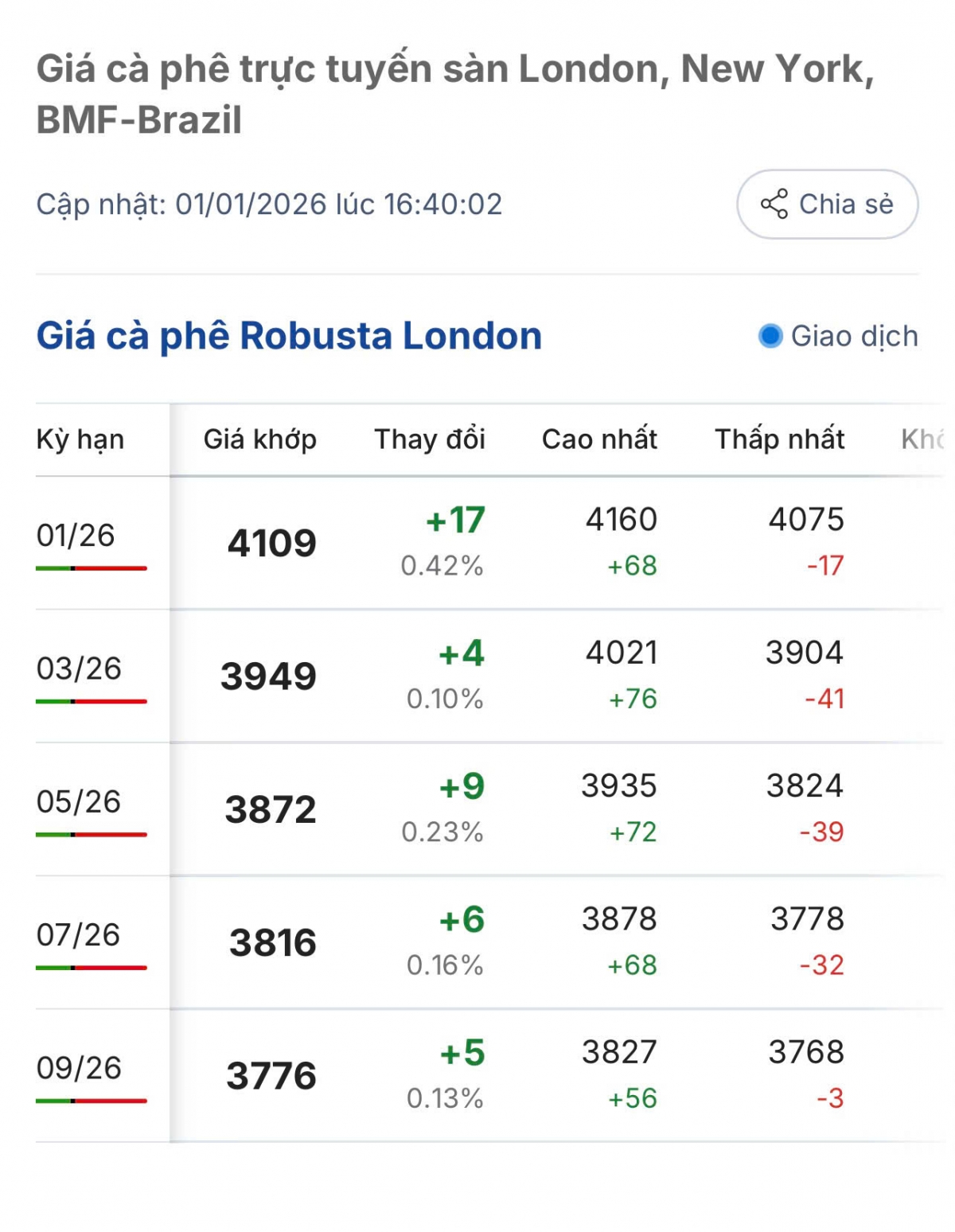 Cụ thể, giá cà phê Robusta giao kỳ hạn tháng 1/2026 trên sàn London đang niêm yết ở mức 4.019 USD/tấn, ổn định so với phiên sáng 1/1/2026, còn giá cà phê Arabica trên sàn New York kỳ hạn giao tháng 3/2026 là 348,75 US cent/lb.