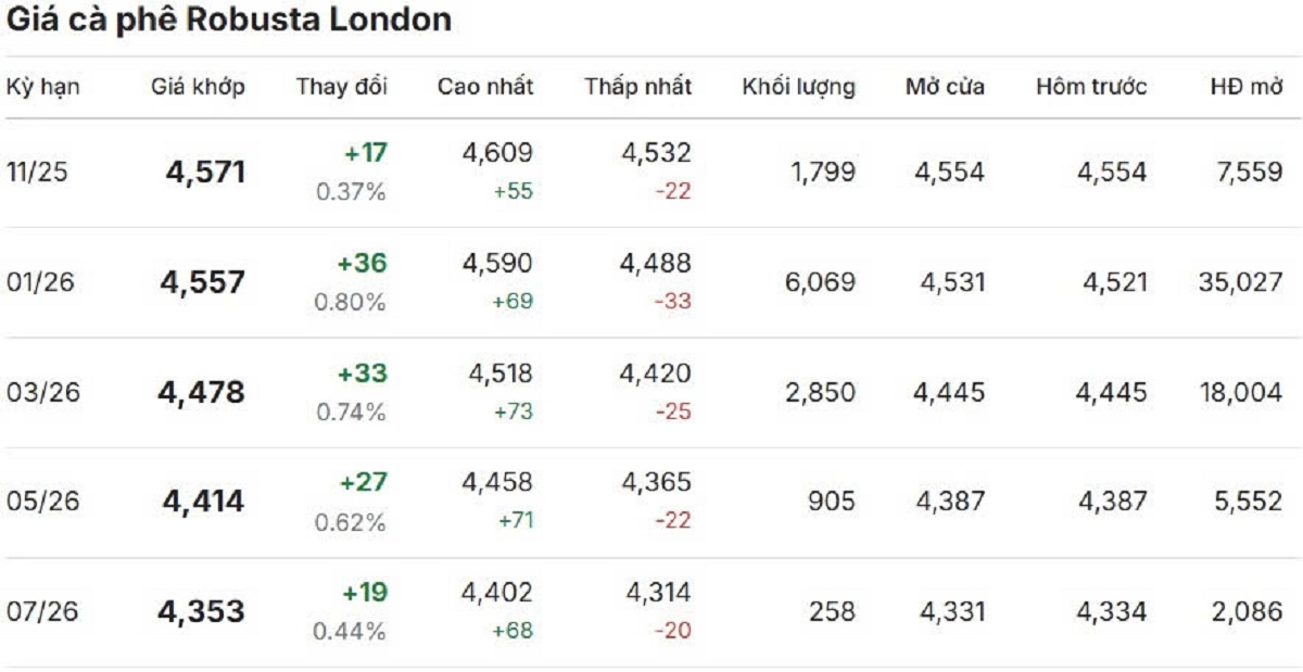 Trên thị trường thế giới, giá cà phê đồng loạt điều chỉnh giảm. Cụ thể, tại sàn London, giá Robusta kỳ hạn giao tháng 11/2025 được giao dịch ở mức 4.571 USD/tấn.