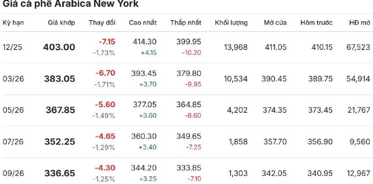 Trong khi đó, trên sàn New York, giá Arabica kỳ hạn giao tháng 12/2025 giữ ở mức 403 US cent/lb.