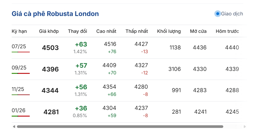 Trên sàn giao dịch London, giá cà phê Robusta đang dao động trong khoảng 4.427 - 4.516 USD/tấn. Cụ thể, giá cà phê Robusta hợp đồng kỳ hạn giao tháng 7/2025 trên sàn London giảm về mức 4.503 USD/tấn, tăng 1,42%, tương đương tăng 63 USD/tấn so với phiên cuối trước.
