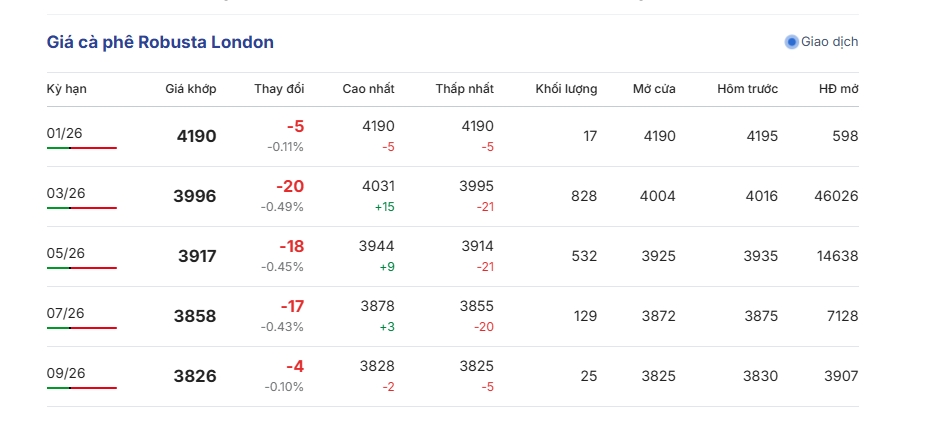Giá cà phê trên thị trường thế giới tối 20/1 (theo giờ Việt Nam) tiếp tục giảm trên cả 2 sàn giao dịch quốc tế. Giá cà phê Robusta London dao động ở mức 3.828 - 4.190 USD/tấn. Cụ thể, giá cà phê Robusta hợp đồng kỳ hạn giao tháng 1/2026 giao dịch ở mức 4.190 USD/tấn, giảm 0,11% tương đương 5 USD/tấn.