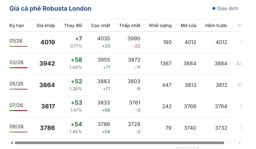 Cụ thể, vào lúc 8h30 sáng 31/12 theo giờ Việt Nam, giá cà phê Robusta giao kỳ hạn tháng 1/2026 trên sàn London đang niêm yết ở mức 4.019 USD/tấn, tăng 0,17%, tương đương 7 USD/tấn. Còn giá cà phê Arabica trên sàn New York kỳ hạn giao tháng 1/2026 là 352,15 US cent/lb, tăng 0,54%.
