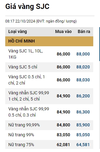 Giá vàng trong nước và thế giới đều đang trong xu hướng tăng mạnh. Theo tin tức cập nhật sáng nay 22/10, giá vàng miếng SJC được niêm yết ở mức 86 - 88 triệu đồng/lượng, trong khi giá vàng nhẫn giao dịch ở ngưỡng 85,6 - 86,63 triệu đồng/lượng.