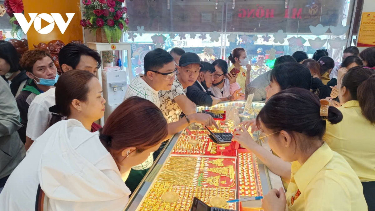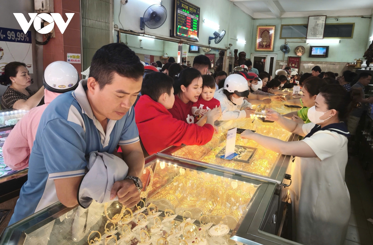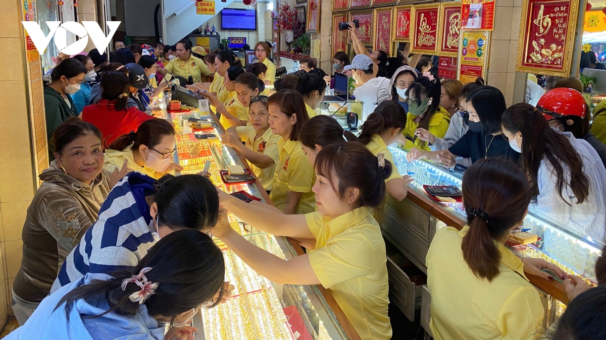 Tại các tiệm vàng Mi Hồng và PNJ, người dân nườm nượp đến từ sớm để mua vàng, với hy vọng lấy may mắn đầu năm và rước tài lộc về nhà.
