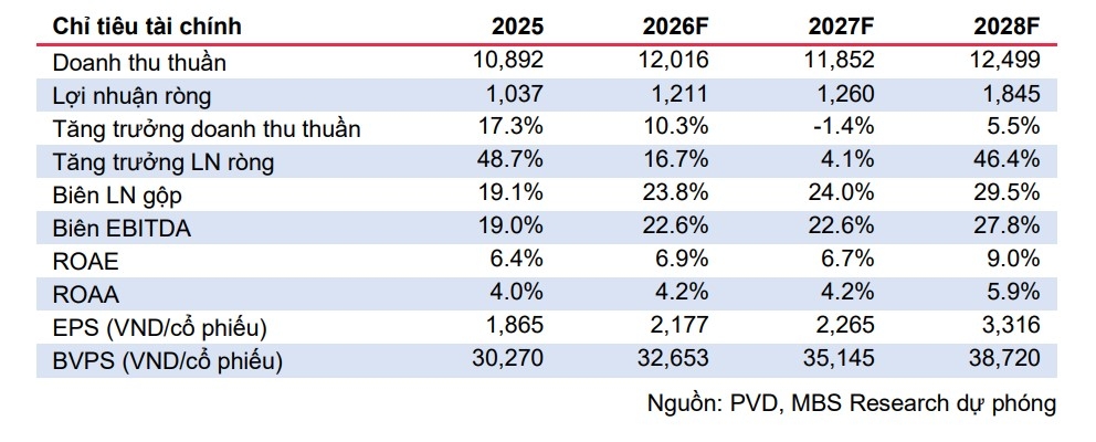 Ngoài ra, trong dự báo trước đây, MBS ước tính PVD không sử dụng các giàn khoan đối tác trong năm 2026. Tuy nhiên, theo cập nhật mới nhất thì PVD có kế hoạch sử dụng tổng cộng 4 giàn khoan đối tác nhằm đáp ứng kịp tiến độ khoan trong bối cảnh nhu cầu cao tại khu vực sẽ giúp thúc đẩy doanh số của PVD. MBS dự phóng lợi nhuận ròng của PVD năm 2027F đạt 1.260 tỷ đồng, tăng nhẹ 4,1% trên mức nền cao của năm 2026.
