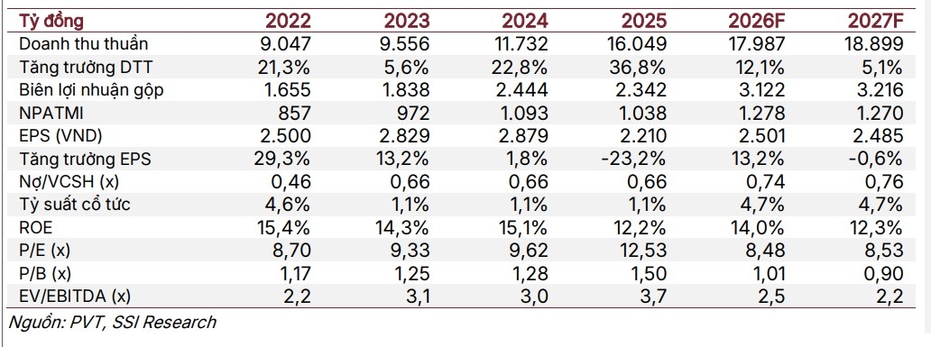 SSI dự báo lợi nhuận sau thuế cổ đông công ty mẹ (NPATMI) năm 2026 đạt 1.278 tỷ đồng (+23% so với cùng kỳ), được thúc đẩy bởi: giá thuê tàu tăng cao, đòn bẩy hoạt động từ chiến lược mở rộng đội tàu và độ tuổi tàu trẻ, và tình trạng khan hiếm kéo dài của công suất tàu chở dầu trên toàn cầu. Ở mức giá 21.700 đồng/cổ phiếu, PVT hiện đang giao dịch ở mức P/E dự phóng 2026 là 8,48x, thấp hơn mức trung bình 5 năm là 9,0x, và P/B dự phóng 2026 là 1,01x, thấp hơn mức trung bình 1,25x.