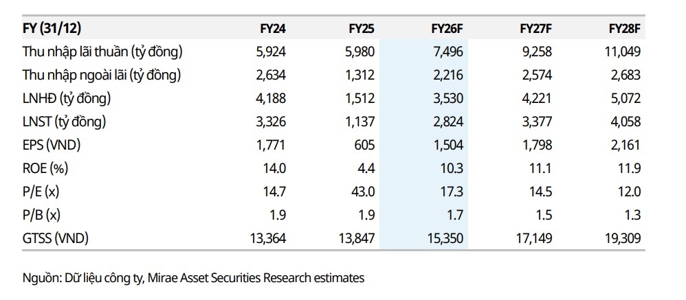 Việc đồng thời hấp thụ áp lực chi phí vốn và xử lý bảng cân đối kế toán đã đẩy lợi nhuận 2025 xuống vùng đáy, qua đó tạo nền tảng phục hồi trong FY26. Lợi nhuận trước thuế (LNTT) dự phóng đạt 3.530 tỷ đồng (+134% so với cùng kỳ; thấp hơn kế hoạch 4.000 tỷ đồng), được hỗ trợ bởi tăng trưởng NII 25,4% (tăng trưởng tín dụng 16,5%, NIM phục hồi lên 2,74%), thu nhập phí phục hồi 193% từ mức nền thấp FY25 (241 tỷ đồng), CIR giảm về 49%, và chi phí dự phòng giảm 7% xuống 1,423 tỷ đồng. ROE dự kiến phục hồi lên 10,3%.