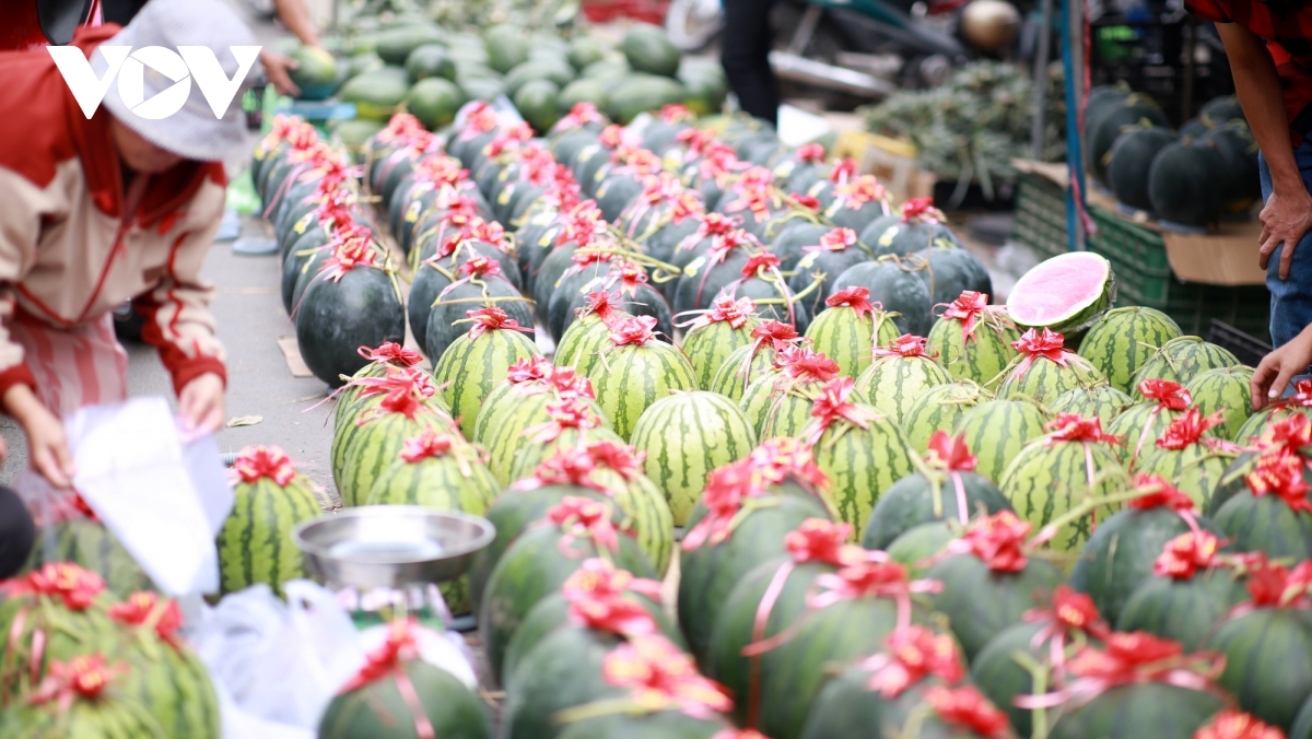 Trong khi đó, giá cả các loại trái cây chưng hay để làm mâm ngũ quả tăng nhẹ và bán khá đắt hàng. Dừa non để chưng có giá 5 – 10.000 đồng/trái, sung 10.000 đồng/chùm, mãng cầu từ 40.000 – 80.000 đồng/kg; dưa hấu chưa điêu khắc có giá khoảng 15 - 20.000 đồng/kg; đã chạm khắc có giá từ 25.000 đồng/kg, thanh long từ 20.000 – 35.000 đồng/kg…