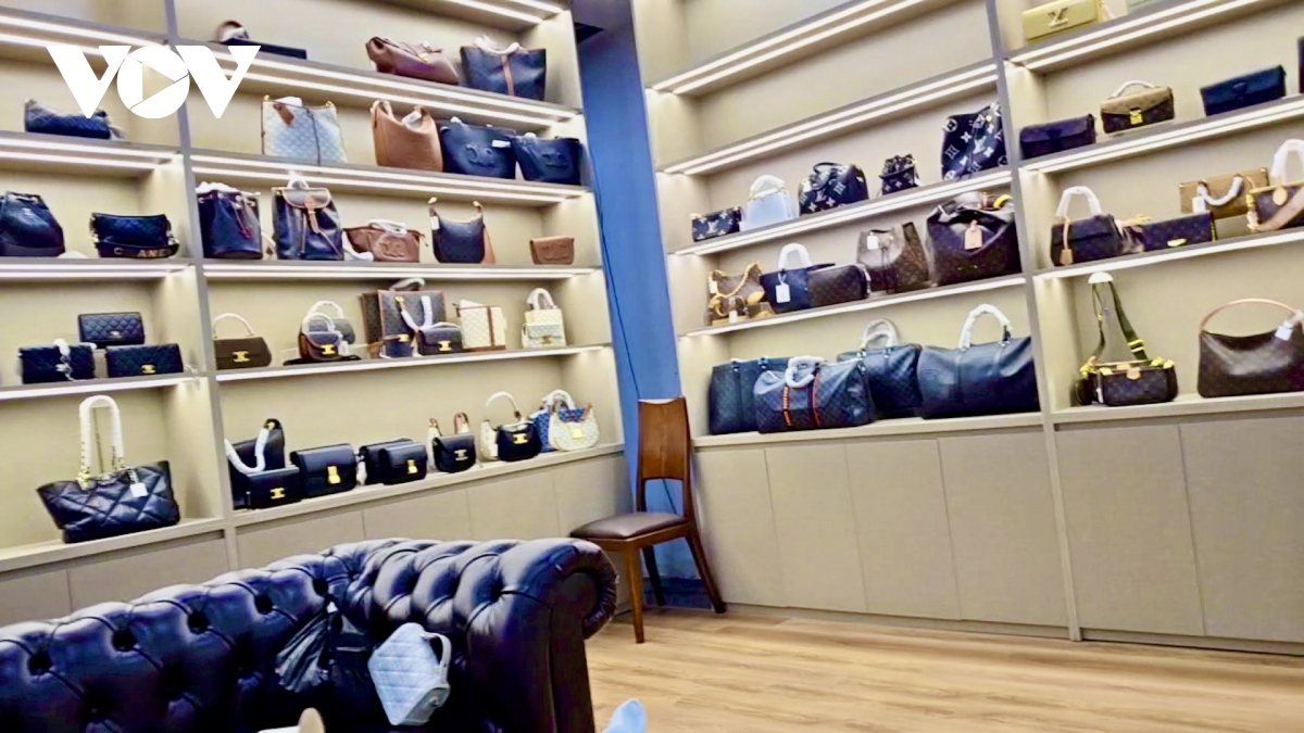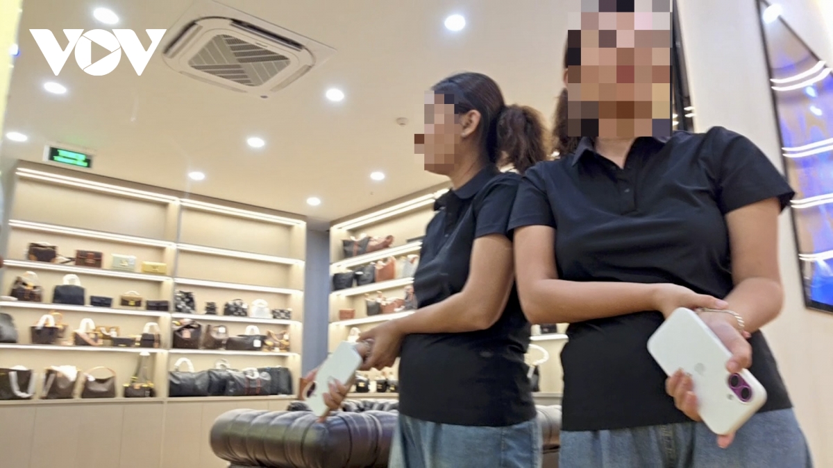 Căn phòng rộng hàng trăm m2, được thiết kế bài bản, sang trọng. Nhân viên bán hàng khẳng định: "Hầu hết ở đây là hàng 1:1, da thật, bao đổi trả, tức là trong thời gian từ 3 đến 7 ngày, sản phẩm có bị lỗi về da, chúng em sẽ đổi trả lại cho mình". Phóng viên hỏi: "So với hàng thật thì những cái này có khác nhiều không em?". Nhân viên lập tức đáp: "Cái này là hàng loại rep giống hàng thật đấy anh. Tại vì sếp của em là người Hàn đấy, ông ấy sẽ làm việc trực tiếp với bên Hàn, sẽ đem những mẫu này tương đương hàng thật luôn. Nếu là hàng thật thì giá nó sẽ rất cao."