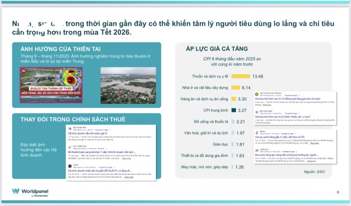 Theo khảo sát của Numerator (công ty công nghệ và dữ liệu trong lĩnh vực nghiên cứu thị trường), Tết 2026, người tiêu dùng ưu tiên mua sắm cho những nhu cầu thiết thực, như: chăm sóc bản thân, gia đình, quà tặng và giảm hẳn tiệc tùng, sản phẩm cao cấp. Có 52% người tiêu dùng cho biết sẽ mua sắm nhiều hơn cho bản thân và gia đình; 49% cho biết chi cho chăm sóc sắc đẹp nhiều hơn; 42% cho biết nấu nhiều hơn các món ăn sáng tạo, truyền thống kết hợp hiện đại…