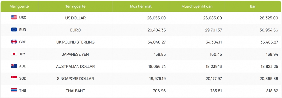 Cụ thể, ngân hàng Vietcombank công bố giao dịch tại 26.055 - 26.325 đồng/USD (mua vào và bán ra), giữ nguyên từ phiên trước đó.