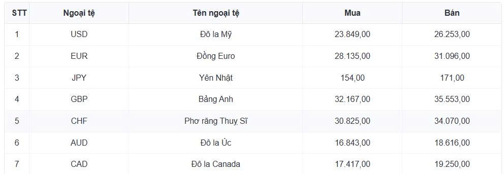 Tỷ giá các ngoại tệ mạnh khác trong giỏ thanh toán quốc tế, tại Ngân hàng Vietcombank được niêm yết như sau:
