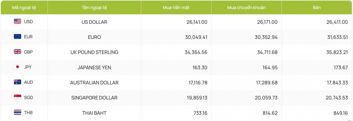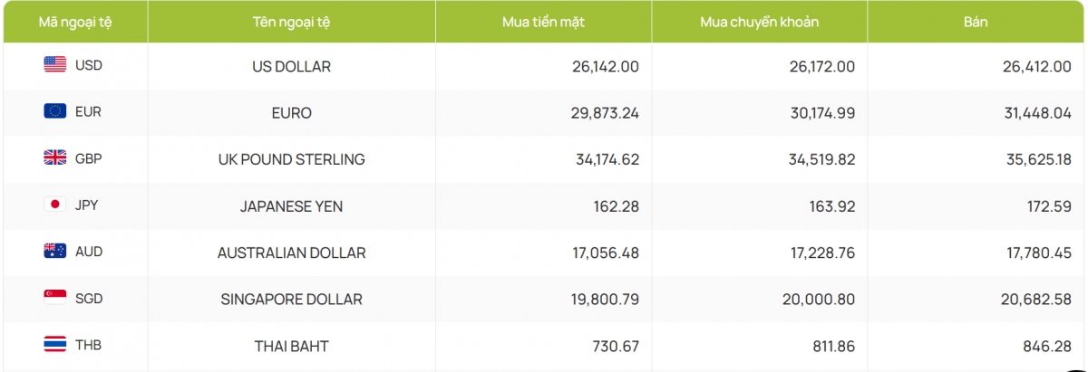Còn ACB bắt đầu hôm nay với 26.150 đồng/USD mua vào và 26.411 đồng/USD bán ra, giá bán đã thấp hơn phiên trước 1 đồng còn giá mua không đổi.