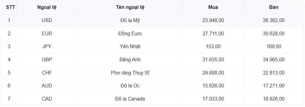 Tỷ giá các ngoại tệ mạnh khác trong giỏ thanh toán quốc tế, tại Ngân hàng Vietcombank được niêm yết như sau: