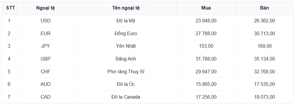 Tỷ giá các ngoại tệ mạnh khác trong giỏ thanh toán quốc tế, tại Ngân hàng Vietcombank được niêm yết như sau: