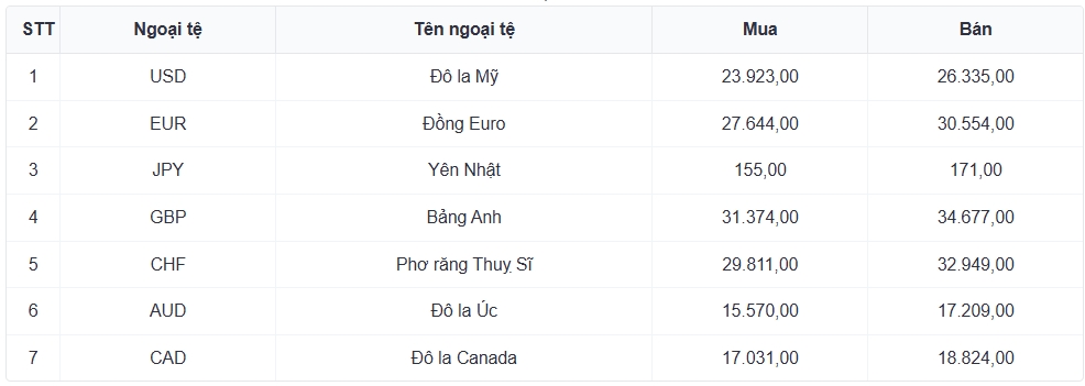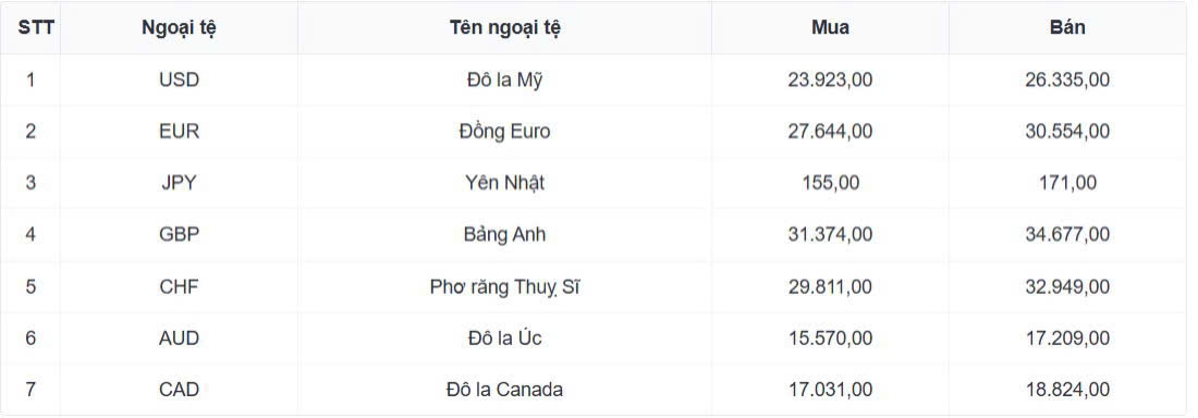 Tỷ giá các ngoại tệ mạnh khác trong giỏ thanh toán quốc tế, tại Ngân hàng Vietcombank được niêm yết như sau: