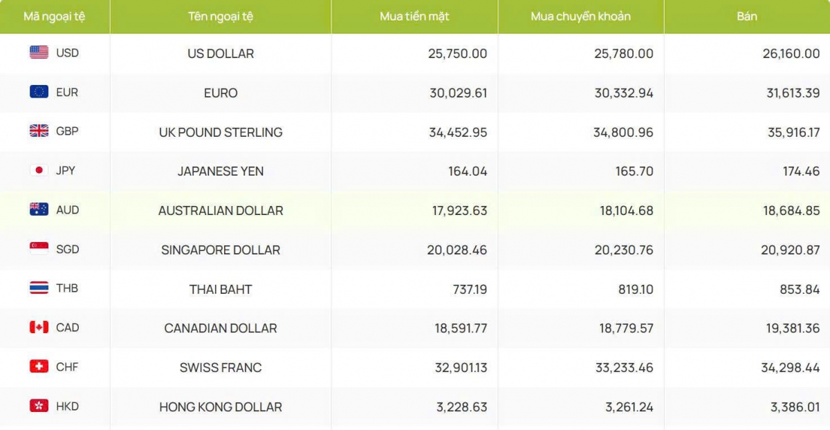 Cụ thể, ngân hàng Vietcombank công bố giao dịch tại 25.750 - 26.160 đồng/USD (mua vào và bán ra), giữ nguyên từ phiên trước đó.