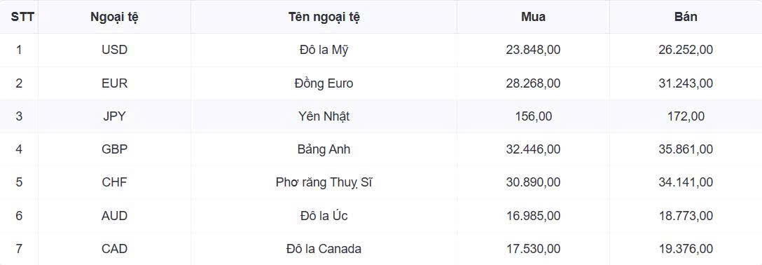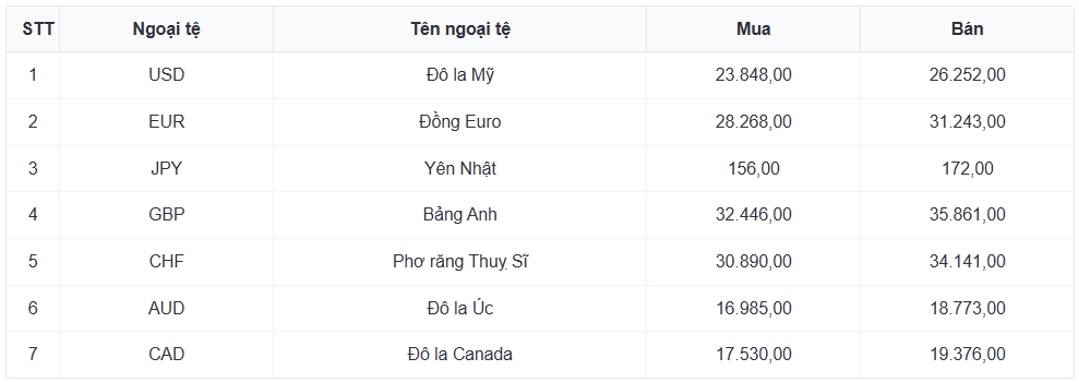 Tỷ giá các ngoại tệ mạnh khác trong giỏ thanh toán quốc tế, tại Ngân hàng Vietcombank được niêm yết như sau: