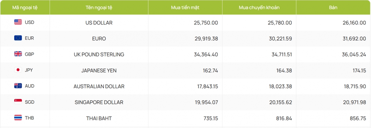 Ngân hàng Vietcombank niêm yết tại 25.750 - 26.160 đồng/USD (mua vào và bán ra), không thay đổi so với phiên trước.