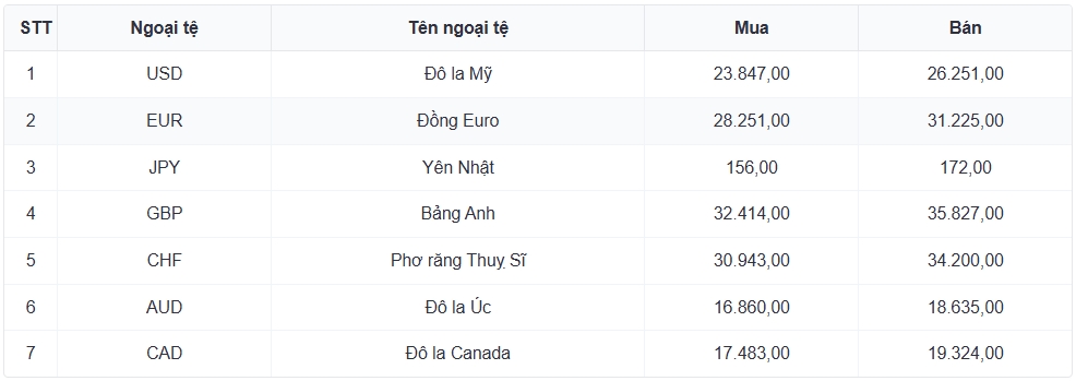 Tỷ giá các ngoại tệ mạnh khác trong giỏ thanh toán quốc tế, tại Ngân hàng Vietcombank được niêm yết như sau: