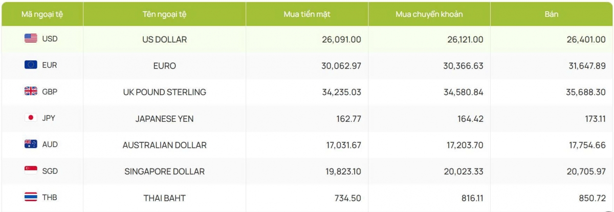 Còn ACB bắt đầu hôm nay với 26.090 đồng/USD mua vào và 26.401 đồng/USD bán ra, so với phiên trước đã giảm 10 đồng chiều mua và 4 đồng chiều bán.
