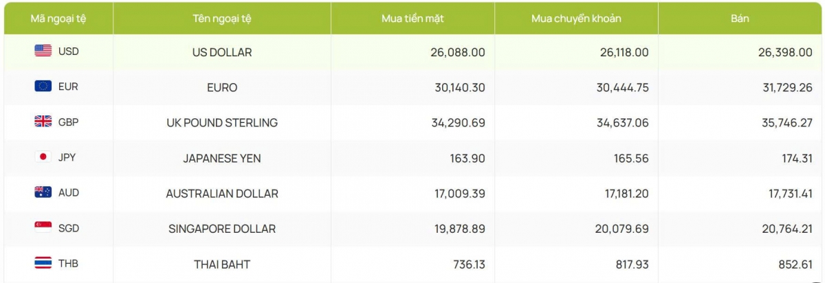 Ngân hàng Vietcombank niêm yết tại 26.091 - 26.401 đồng/USD (mua vào và bán ra), không thay đổi so với phiên trước.