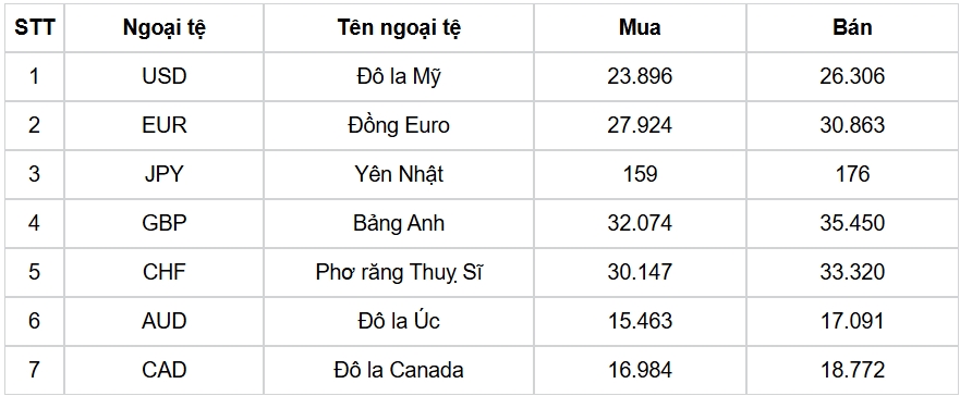 Tỷ giá các ngoại tệ mạnh khác trong giỏ thanh toán quốc tế, tại Ngân hàng Vietcombank được niêm yết như sau: