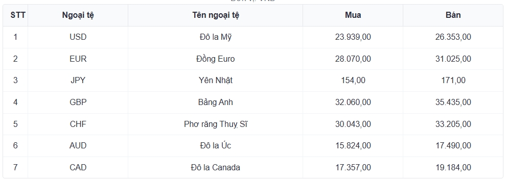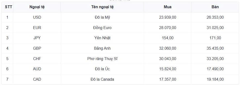 Tỷ giá các ngoại tệ mạnh khác trong giỏ thanh toán quốc tế, tại Ngân hàng Vietcombank được niêm yết như sau:
