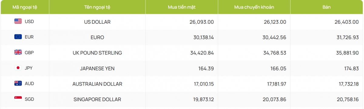 Ngân hàng Vietcombank tạm nghỉ hôm nay niêm yết tại 26.093 - 26.403 đồng/USD (mua vào và bán ra), không thay đổi kể từ phiên trước đó.
