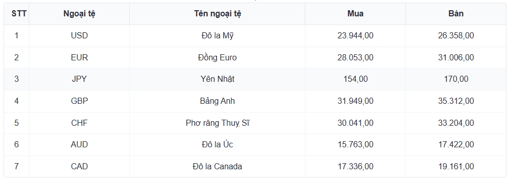 Tỷ giá các ngoại tệ mạnh khác trong giỏ thanh toán quốc tế, tại Ngân hàng Vietcombank được niêm yết như sau: