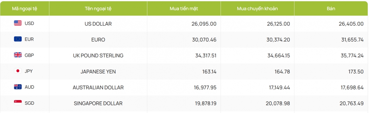 Ngân hàng Vietcombank niêm yết tại 26.095 - 26.405 đồng/USD (mua vào và bán ra), giữ nguyên cả hai chiều so với phiên trước đó.