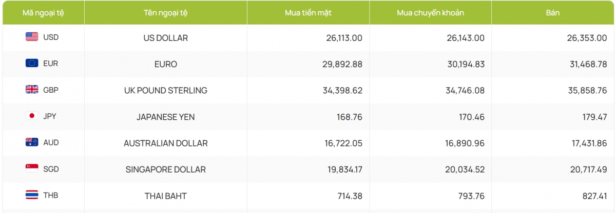 Ngân hàng Vietcombank niêm yết tại 26.116 - 26.356 đồng/USD (mua vào và bán ra), không đổi kể từ phiên liền trước.