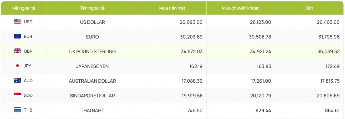 Ngân hàng Vietcombank niêm yết tại 26.093 - 26.403 đồng/USD (mua vào và bán ra), giữ nguyên cả hai chiều so với phiên liền trước.