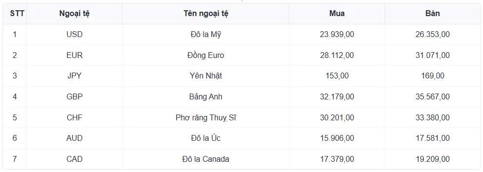 Tỷ giá các ngoại tệ mạnh khác trong giỏ thanh toán quốc tế, tại Ngân hàng Vietcombank được niêm yết như sau: