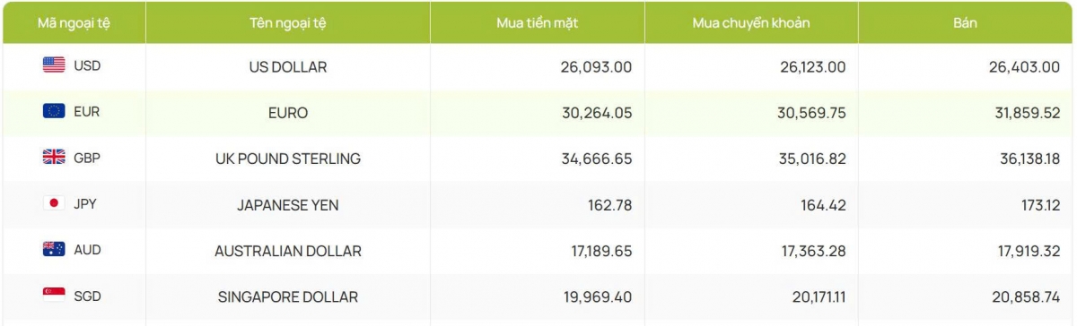 Cụ thể, ngân hàng Vietcombank công bố giao dịch ở mốc 26.093 - 26.403 đồng/USD (mua vào và bán ra), giữ nguyên cả hai chiều so với phiên trước đó.