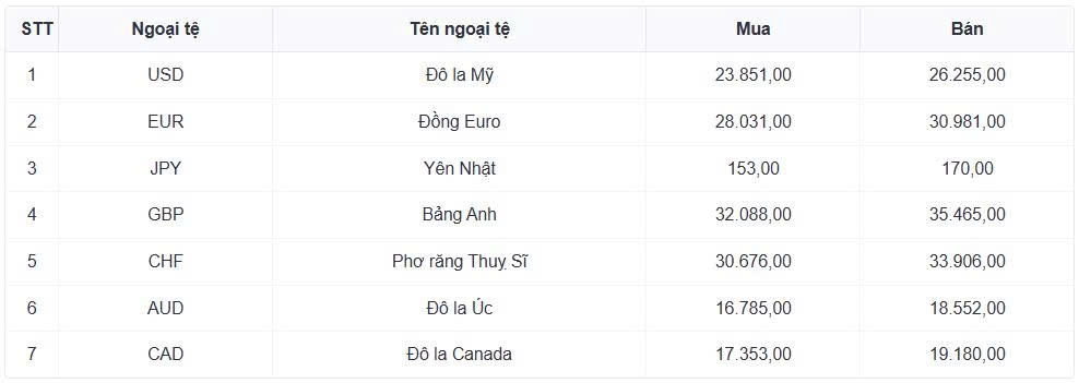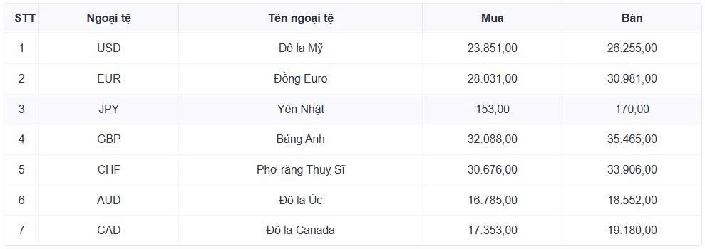 Tỷ giá các ngoại tệ mạnh khác trong giỏ thanh toán quốc tế, tại Ngân hàng Vietcombank được niêm yết như sau: