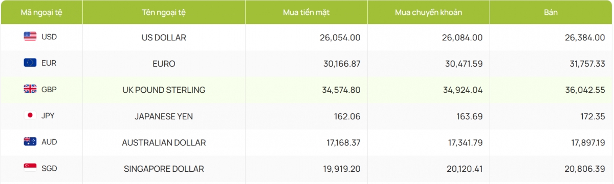 Ngân hàng Vietcombank niêm yết tại 26.054 - 26.384 đồng/USD (mua vào và bán ra), giữ nguyên từ phiên liền trước.