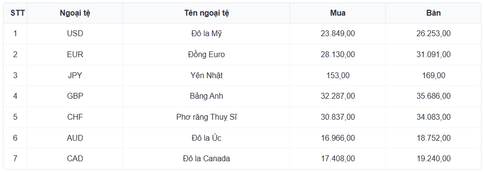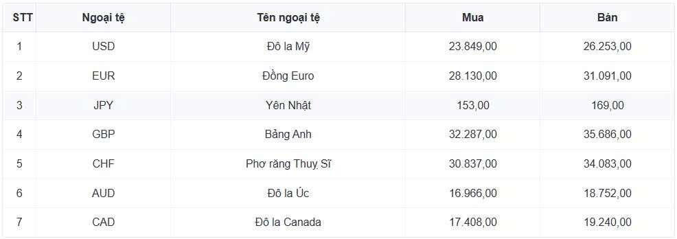 Tỷ giá các ngoại tệ mạnh khác trong giỏ thanh toán quốc tế, tại Ngân hàng Vietcombank được niêm yết như sau: