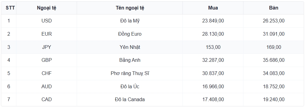 Tỷ giá các ngoại tệ mạnh khác trong giỏ thanh toán quốc tế, tại Ngân hàng Vietcombank được niêm yết như sau: