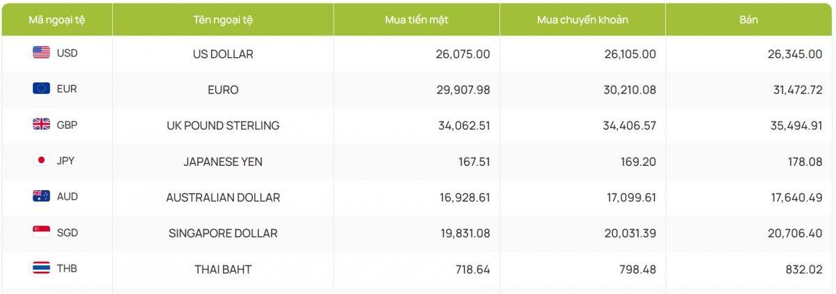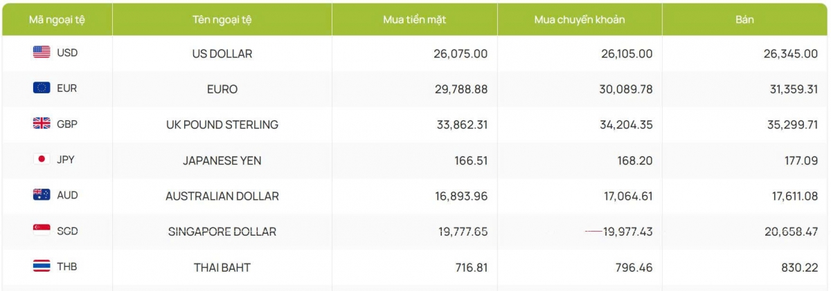 Ngân hàng Vietcombank niêm yết tại 26.075 - 26.345 đồng/USD (mua vào và bán ra), không điều chỉnh so với phiên liền trước.